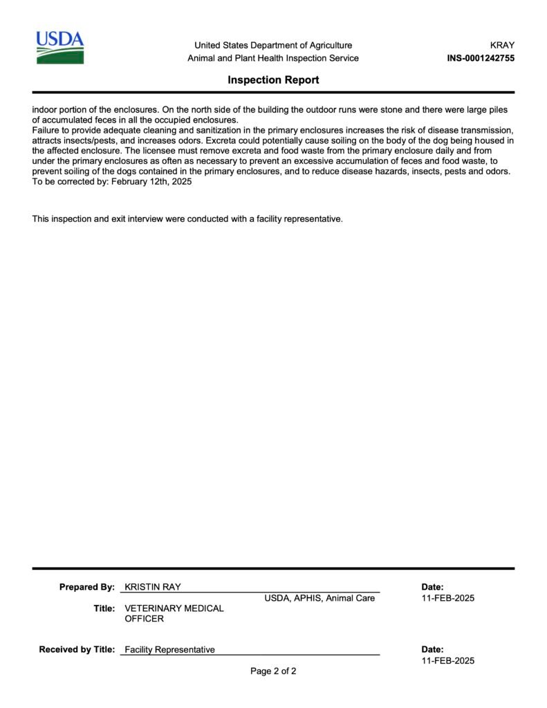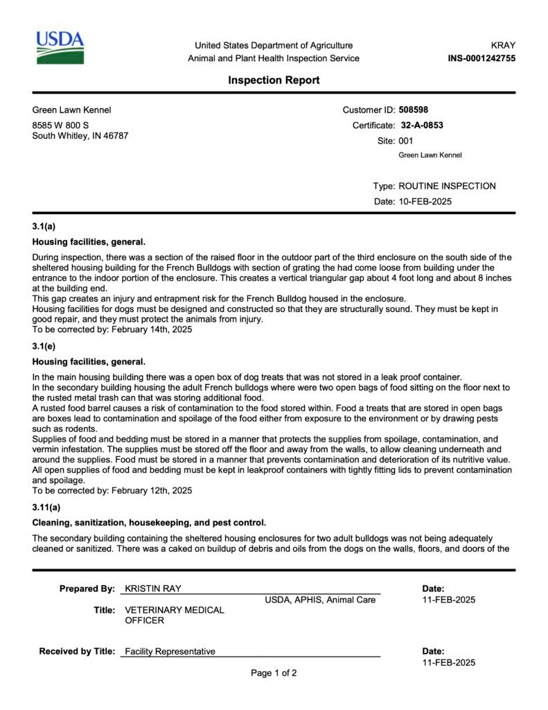 Green Lawn Kennel, which Bailing Out Benji was actively working to protect by betraying me to their broker, had 112 dogs at their 2/10/25 USDA inspection, where the facility was cited for the following violations: unsafe housing; improper storage of food; dirty walls, floors, and doors; and large piles of accumulated feces. USDA inspections like this are unannounced. But when Mindi visits a puppy mill, the owners are given plenty of notice, allowing them to clean up in advance, as Green Lawn Kennel no doubt did before she visited this puppy mill with a Lovable Gold Star Puppies employee.