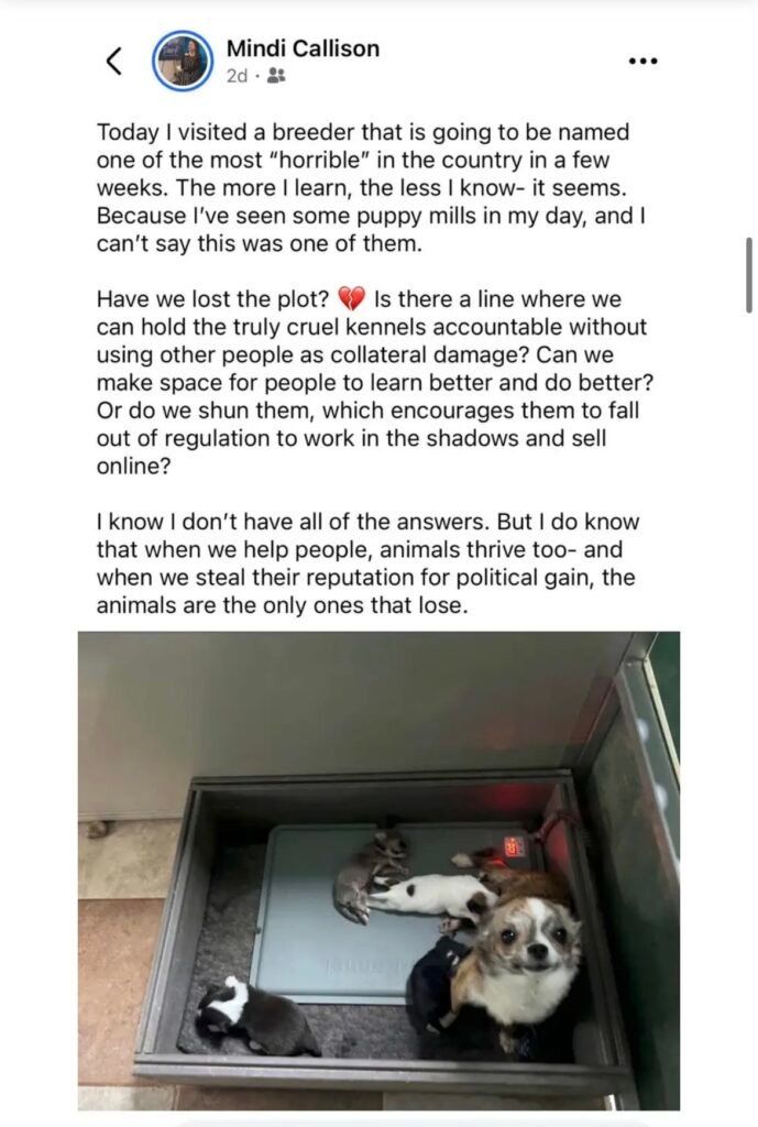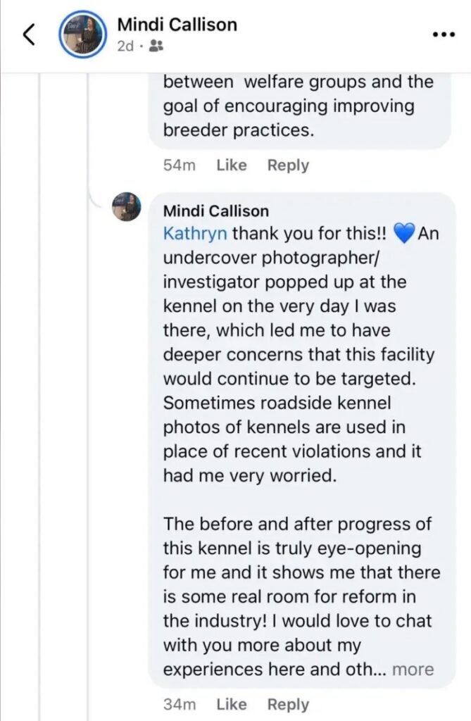 On a March 5, 2026, Mindi commented on her March 3 Facebook post, “An undercover photographer/investigator popped up at the kennel on the very day I was there ….” She went on to say she felt the facility should not have been targeted for an investigation, and that there was nothing wrong with breeding dogs for commercial sale in this case because she felt the facility acted in a reputable manner.